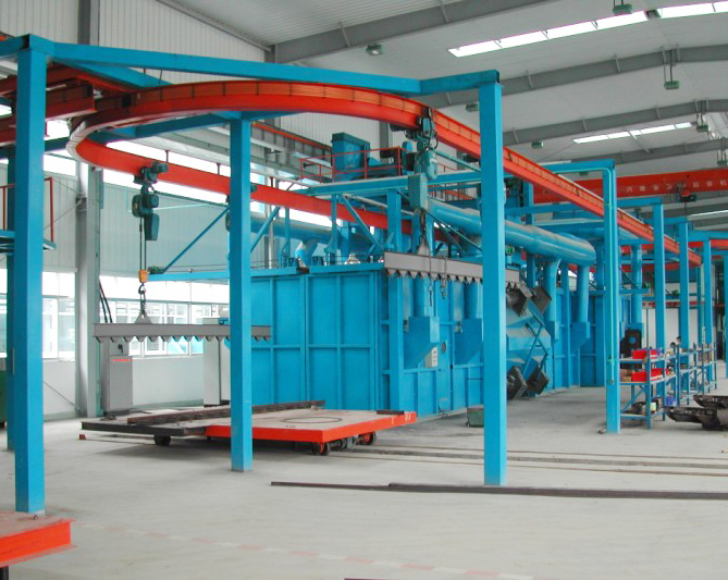 該系列懸掛式拋丸清理機是利用高效強力拋丸器拋出的高速丸流,拋打位于室體內對著拋射位置定點旋轉的工件表面與內腔,去掉其上的粘砂、氧化銹層及其他雜物,使之獲得一定精細的光亮表面,從而提高了工件的表飾質量。本機廣泛應用于鋼鐵、冶金、機車車輛、工程機械、重礦機械等行業。